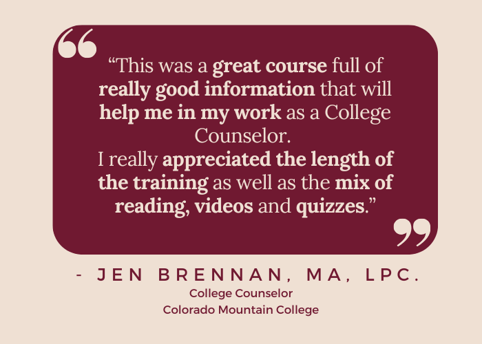 This course provides a foundation for transforming colleges and universities into strengths-based environments in which all students, faculty, and staff can thrive. It builds participants’ knowledge and skills to apply trauma-informed principles in practical ways across the educational setting. Participants will learn crucial information and obtain resources to build a campus culture that promotes positive mental health, student retention and student success.