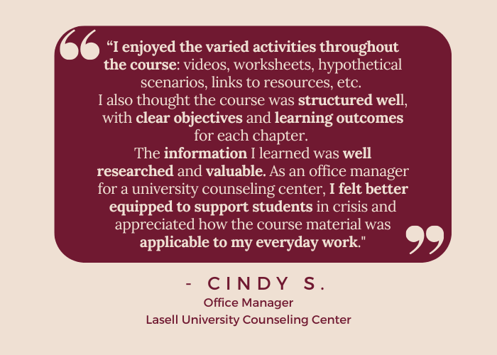 The Professional Certification in College Student Wellbeing, Trauma, & Resilience enables professionals to develop knowledge and skills to improve service delivery in a wide variety of human services.